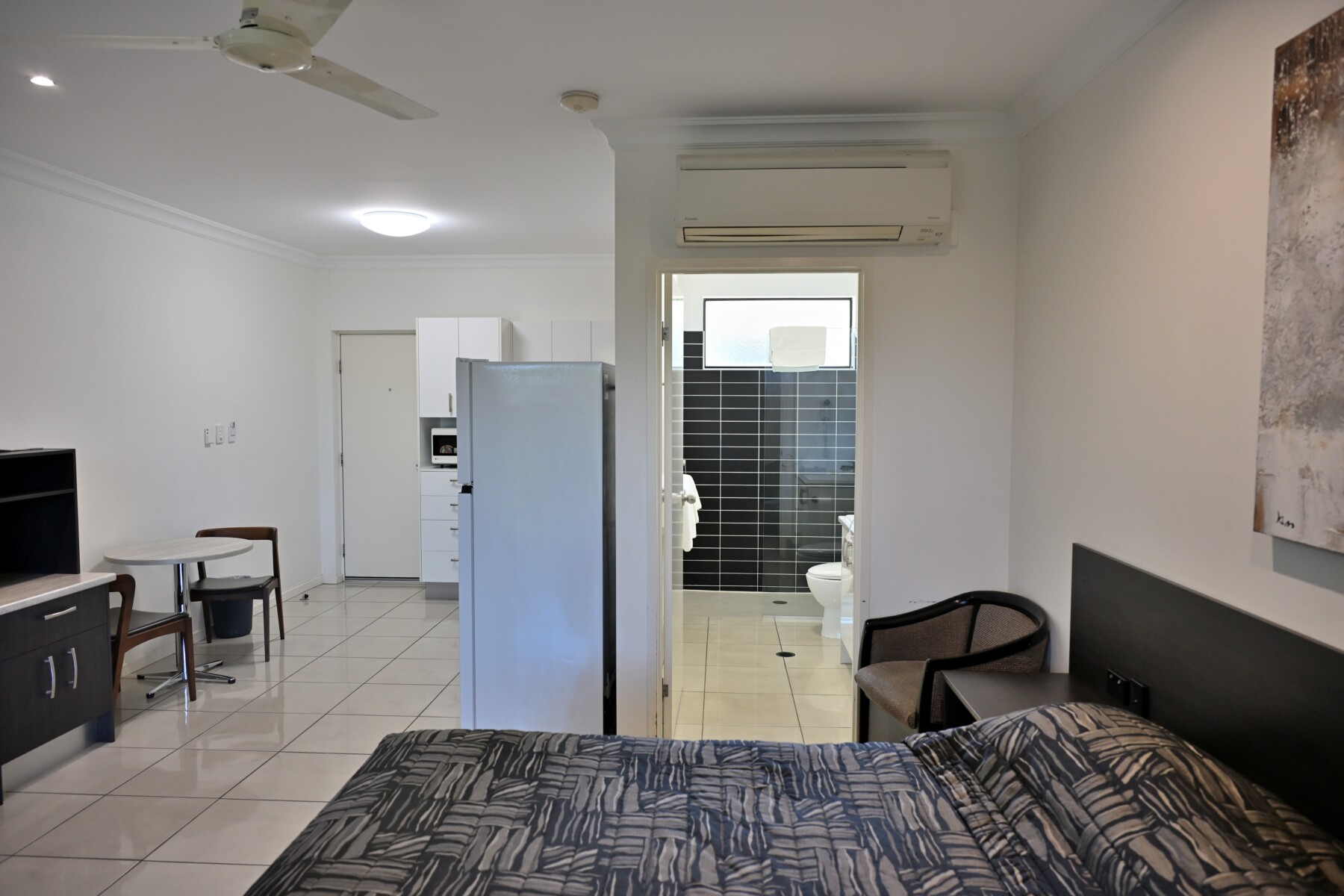 Located in the apartment complex across the road from the motel. A very comfortable nights stay in our newer executive rooms with our new King plush beds, a fully stocked kitchen and a 55inch smart tv. Private balcony to each room.