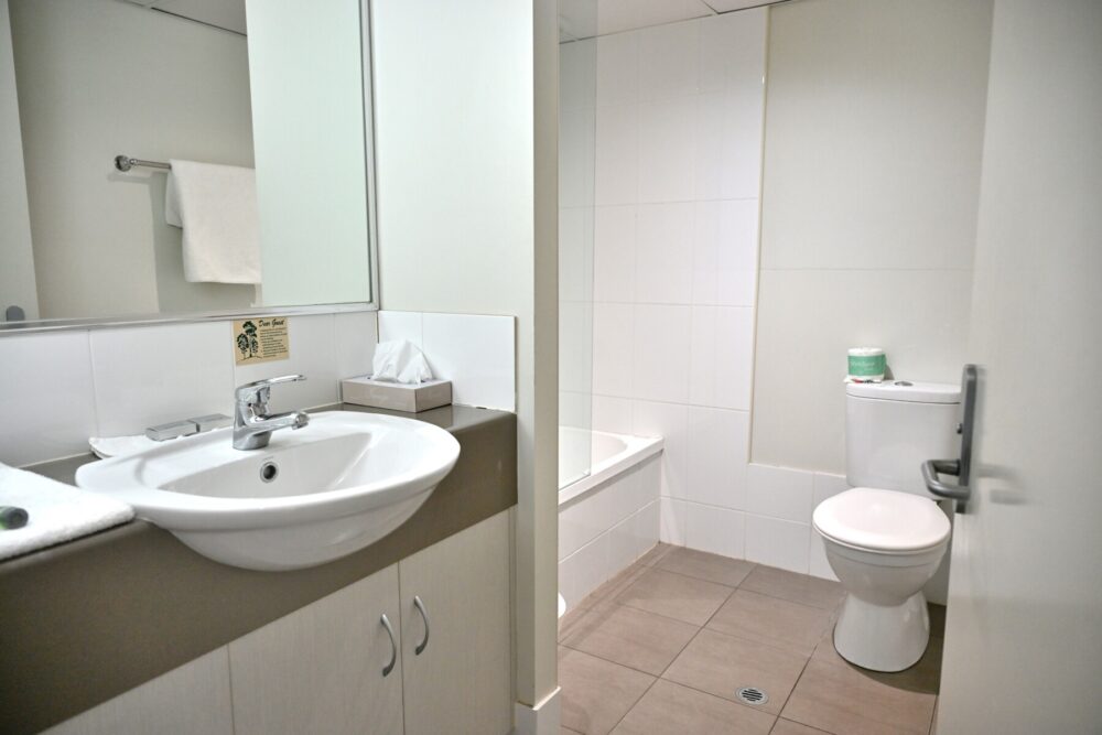 Bath tub with step in shower, air conditioning, room service, high speed internet, table and chairs, hair dryer.