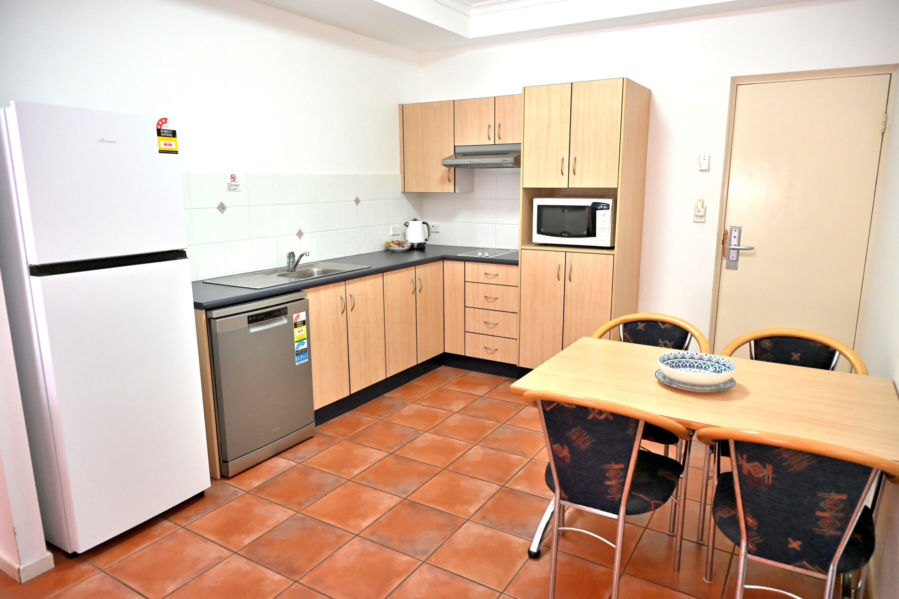 Located in the apartment complex across the road from the motel. All of the rooms in this room type are located downstairs. A very comfortable nights stay in our family style apartment offering two bedrooms, one bathroom with washer and dryer, a full size kitchen with full size refrigerator, dining area and lounge area with 55inch smart tv and sliding doors off the living.