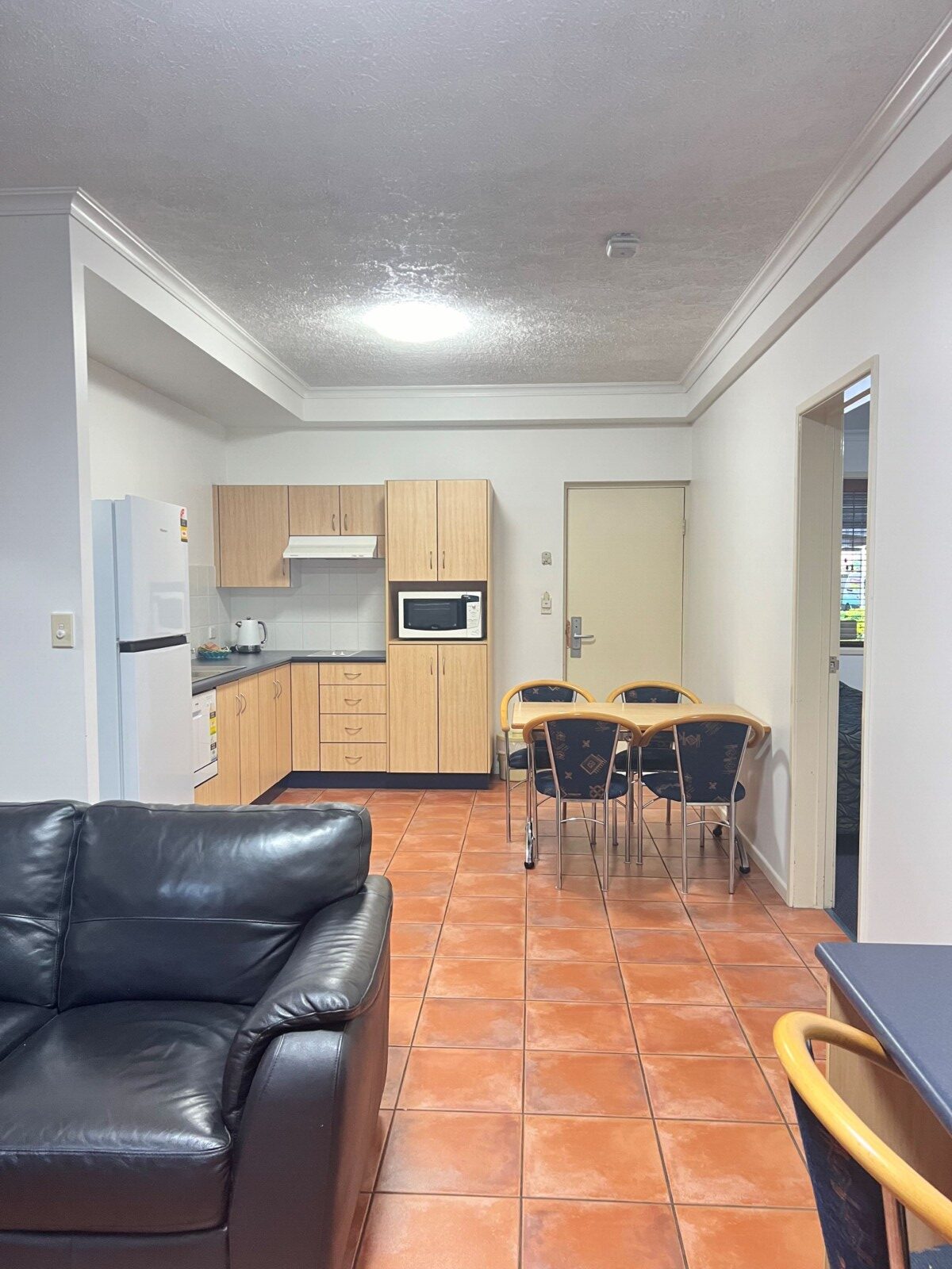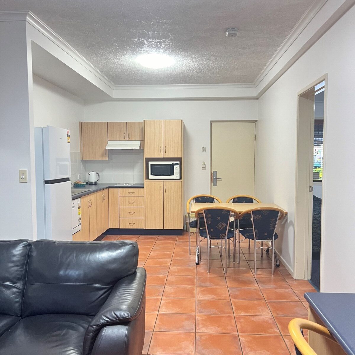 Located in the apartment complex across the road from the motel. All of the rooms in this room type are located downstairs. A very comfortable nights stay in our family style apartment offering two bedrooms, one bathroom with washer and dryer, a full size kitchen with full size refrigerator, dining area and lounge area with 55inch smart tv and sliding doors off the living.