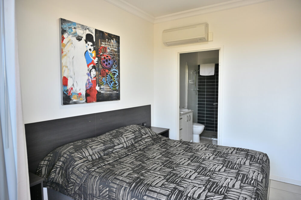 Located in the apartment complex across the road from the motel. A very comfortable nights stay in our newer executive style full apartment offering two bedrooms each with private ensuite, a full size kitchen with full size refrigerator, washer and dryer, lounge area with 55inch smart tv and large balcony.